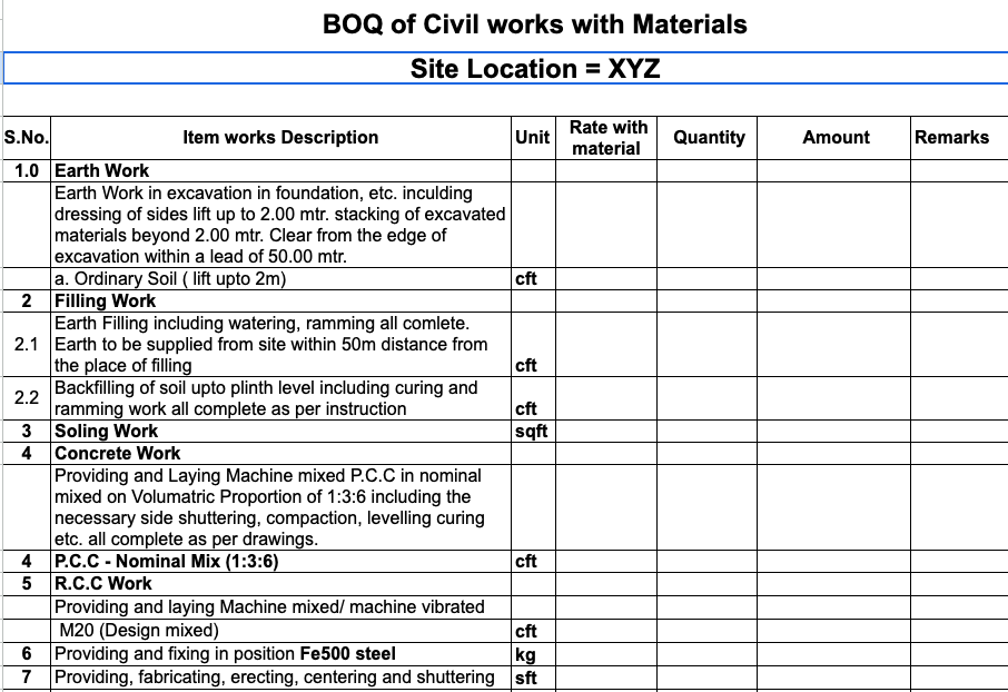 This post includes a free BOQ sample template for civil works with standard items like earthwork, PCC, RCC, steel reinforcement, brickwork, plaster, flooring, paint, waterproofing, elevation works, and more.